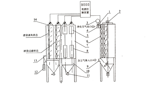 含塵氣體由進氣管進入灰斗,再向上經(jīng)由箱體內(nèi)的濾袋凈化后,由電動三通閥開啟的主閥板處排至出氣管,出氣管的氣體再經(jīng)離心風機,煙囪排入大氣中。