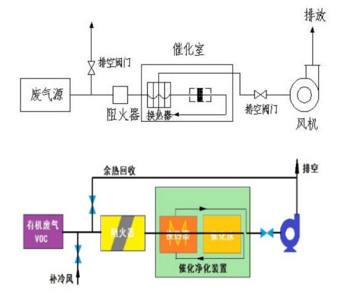 催化氧化技術(shù)(Catalytic Oxidizer,簡(jiǎn)稱CO),通常是指將廢氣加熱到280℃以上,在催化劑的作用下將廢氣分解成CO2和和H2O,催化產(chǎn)生的高溫?zé)崃勘话迨綋Q熱器進(jìn)行循環(huán)熱交換,從而節(jié)省運(yùn)行能耗的一種VOCs治理技術(shù)。