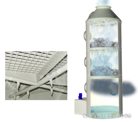 廢氣噴淋凈化塔的工作原理是將氣體中的污染物分離成無害物質(zhì),以達(dá)到凈化氣體的目的,屬于差動接觸逆流,塔體填料是氣液接觸的基本組成部分。進(jìn)入塔體的氣體進(jìn)入塔體后,氣體進(jìn)入填料層,填充層有頂部的噴淋液和前面的噴淋液,并在填料上形成一層液膜。當(dāng)氣體流過間隙時,它與填充物接觸液膜并進(jìn)行吸收或中和反應(yīng)。填充層可以提供足夠大的表面積。氣體的流動,并不會造成太大的阻力,氣體吸收或中和后被除霧器收集,從塔外的出風(fēng)口排出。