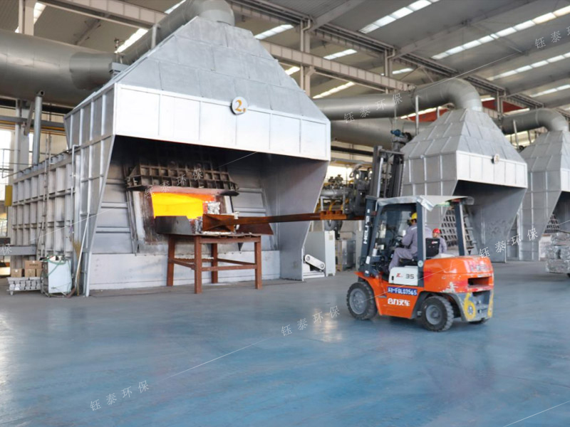 再生鋁雙室爐煙氣處理系統(tǒng)采用XLP高效旋風(fēng)除塵器+強(qiáng)制排風(fēng)冷卻器+脈沖布袋除塵器組成,雙室爐爐門排煙采用2個(gè)排煙罩,2個(gè)爐門罩交替打開;并配套爐膛排料輔助排煙系統(tǒng),1套雙室爐煙氣處理系統(tǒng)處理風(fēng)量≥130000m3/h。除塵器運(yùn)行后將雙室爐燃燒過程產(chǎn)生的高溫?zé)煔猓囟龋?50℃)和爐門罩排出的煙氣全部收集干凈,保證了工人的操作環(huán)境,達(dá)到了規(guī)定的排放標(biāo)準(zhǔn),給生產(chǎn)企業(yè)帶來了巨大的經(jīng)濟(jì)效益。除塵器收集的顆粒污染物主要是熔煉過程中產(chǎn)生的金屬氧化物和非金屬氧化物,還有大量碳?;曳莸?,除塵脫硫后:煙塵濃度:≤10mg/m3。