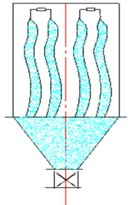 含塵氣體由進(jìn)氣口進(jìn)入灰斗或儲(chǔ)灰箱,通過(guò)花板孔或直接通過(guò)花板孔三種方式進(jìn)入濾袋。如圖2a、b、c所示,含塵氣體透過(guò)濾袋變?yōu)閮魵?,進(jìn)入箱體,再經(jīng)箱體上部排氣口,由風(fēng)機(jī)排走。粉塵積附在濾袋的內(nèi)表面,且不斷增加,使袋收塵器的阻力不斷上升。當(dāng)阻力上升到1500—2000Pa時(shí)為了使袋收塵器繼續(xù)工作,需定期清除濾袋上的粉塵。具體清灰時(shí),首先關(guān)閉頂上風(fēng)機(jī),搖動(dòng)電機(jī)上偏心作用,帶動(dòng)連桿,使搖動(dòng)軸左右來(lái)回轉(zhuǎn)動(dòng),濾袋就呈波紋狀態(tài),使粉塵掉下,卸出。清灰狀態(tài)如圖3所示。