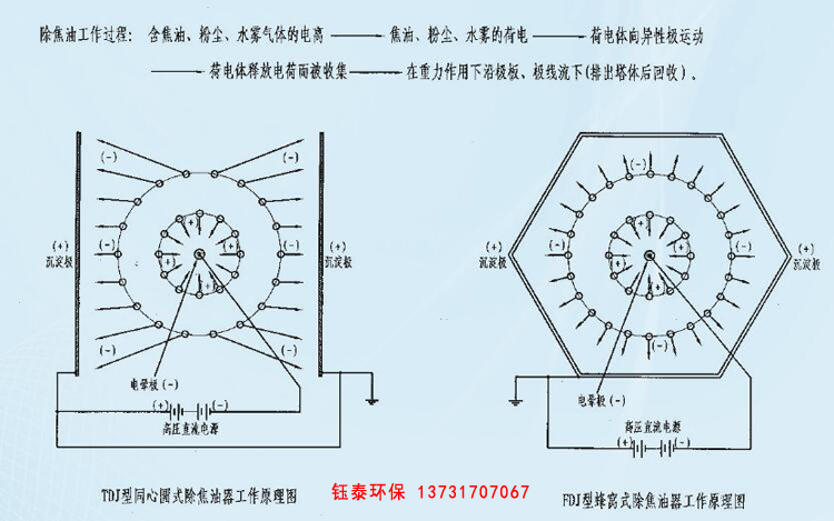 靜電除焦油、油煙、煙塵技術(shù),廣泛應(yīng)用于化肥、焦化、冶金、建材、碳素、蘭碳、城市煤氣等行業(yè)的氣體凈化和液霧的收集。在靜電除焦油器中除去氣體中的焦油、水霧、粉塵后,同時(shí)將煤氣、焦?fàn)t氣中的焦油收集后于以回收。氣體經(jīng)凈化后,對(duì)保證工藝流程中后序設(shè)備一壓縮機(jī)、其它工藝設(shè)備、閥門、管網(wǎng)等的正常穩(wěn)定運(yùn)行,起著至關(guān)重要的作用,所以,靜電除焦油器是理想的具有氣體凈化和焦油回收雙重效果的環(huán)保設(shè)備。